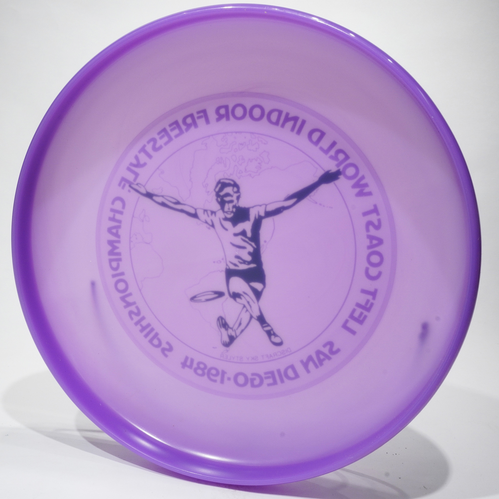 This Custom Sky-Styler from Discraft Products is from a special Gail McColl collection provided by Discraft to the Freestyle Flying Disc Players Association. Discraft offered us the opportunity to list and sell perhaps the largest collection of Sky-Stylers ever. These discs are in excellent condition and offer and beautiful piece of art or an awesome unique jam disc. Many of these discs are from the 80's and are the earliest custom prints and stock models that Discraft offered. Some of the plastic colors have not been available for years. So this is a nice chance to get some of these visually stunning discs out into routines and demonstrations for an enhanced presentation. This is also a chance to see and own some of the history of early freestyle and overall events.