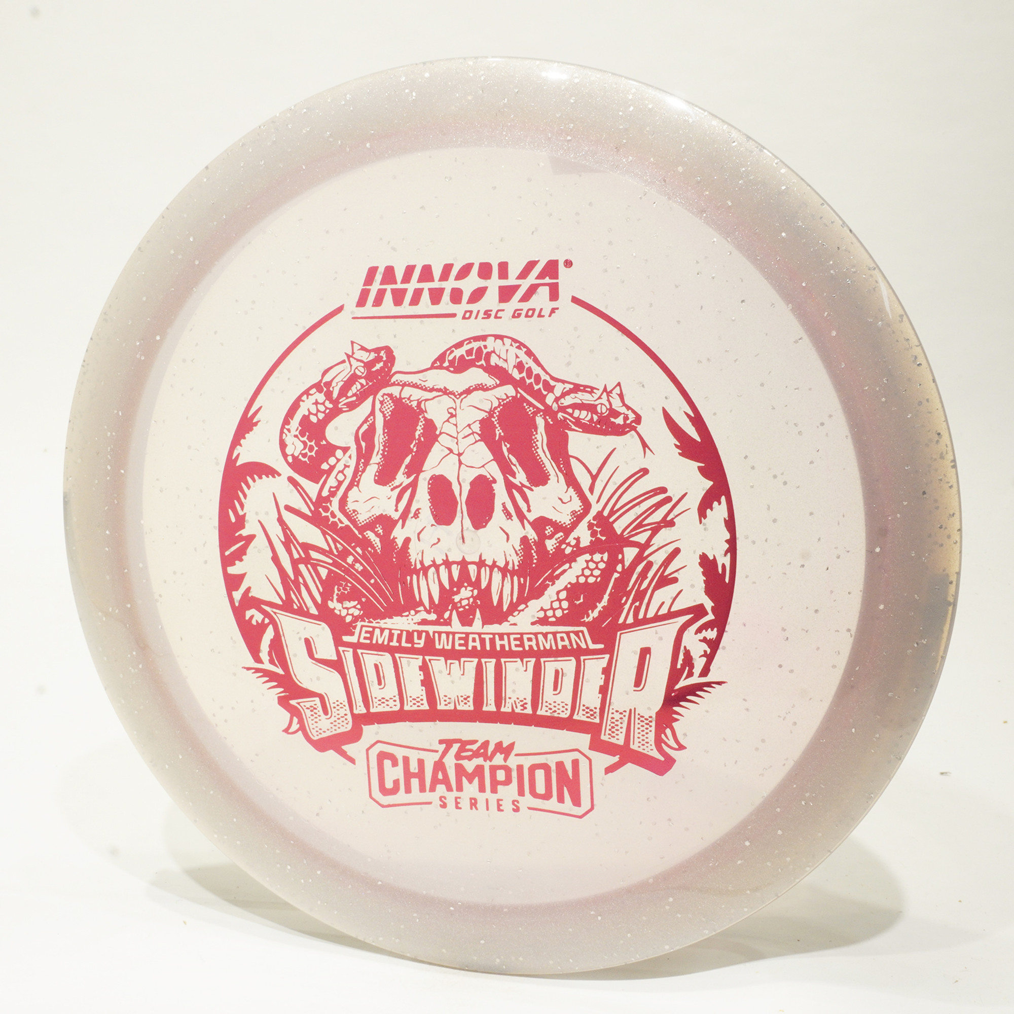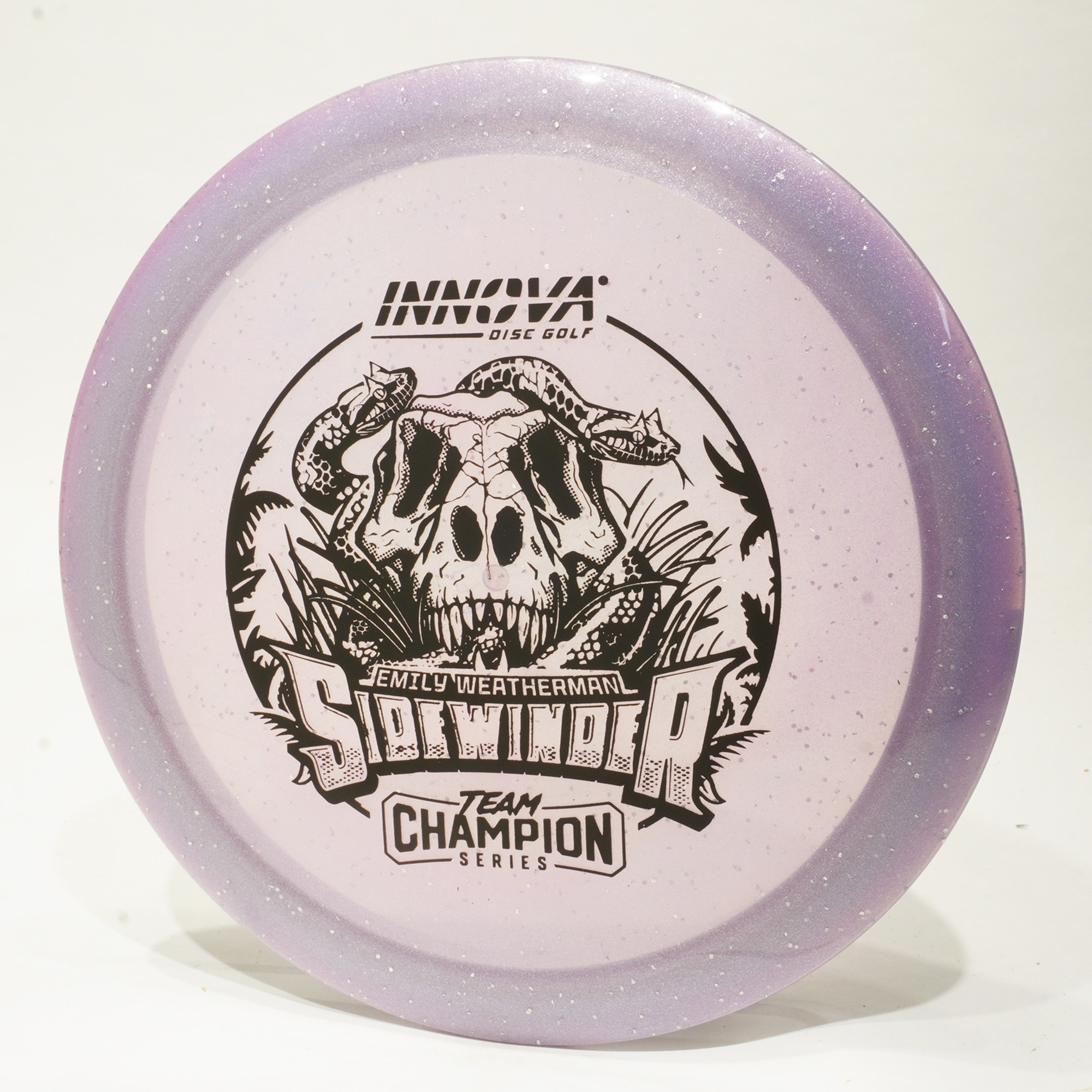 Welcome the 2024 FPO Rookie of the Year to Team Innova! Her new Moondust Champion Sidewinders sparkle as they snake through the sky. You won’t be able to stop staring at this slithering stamp that stares back.