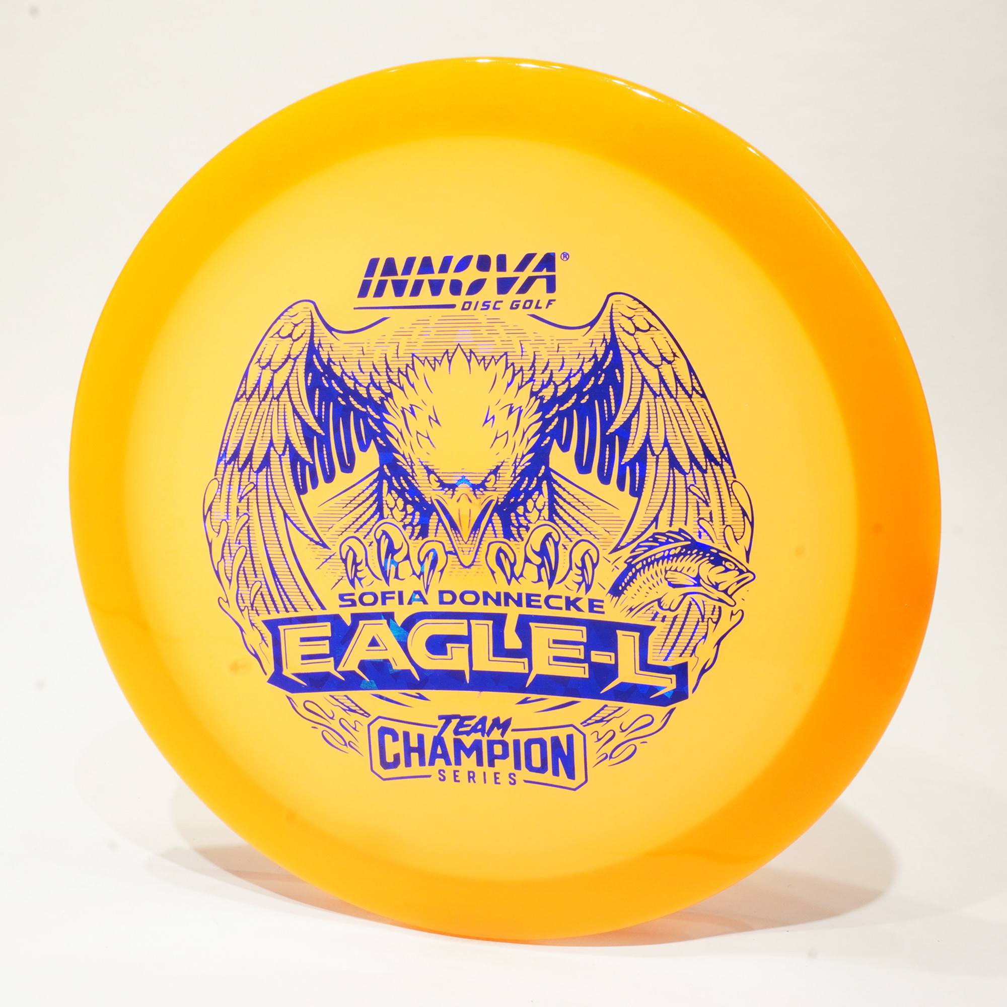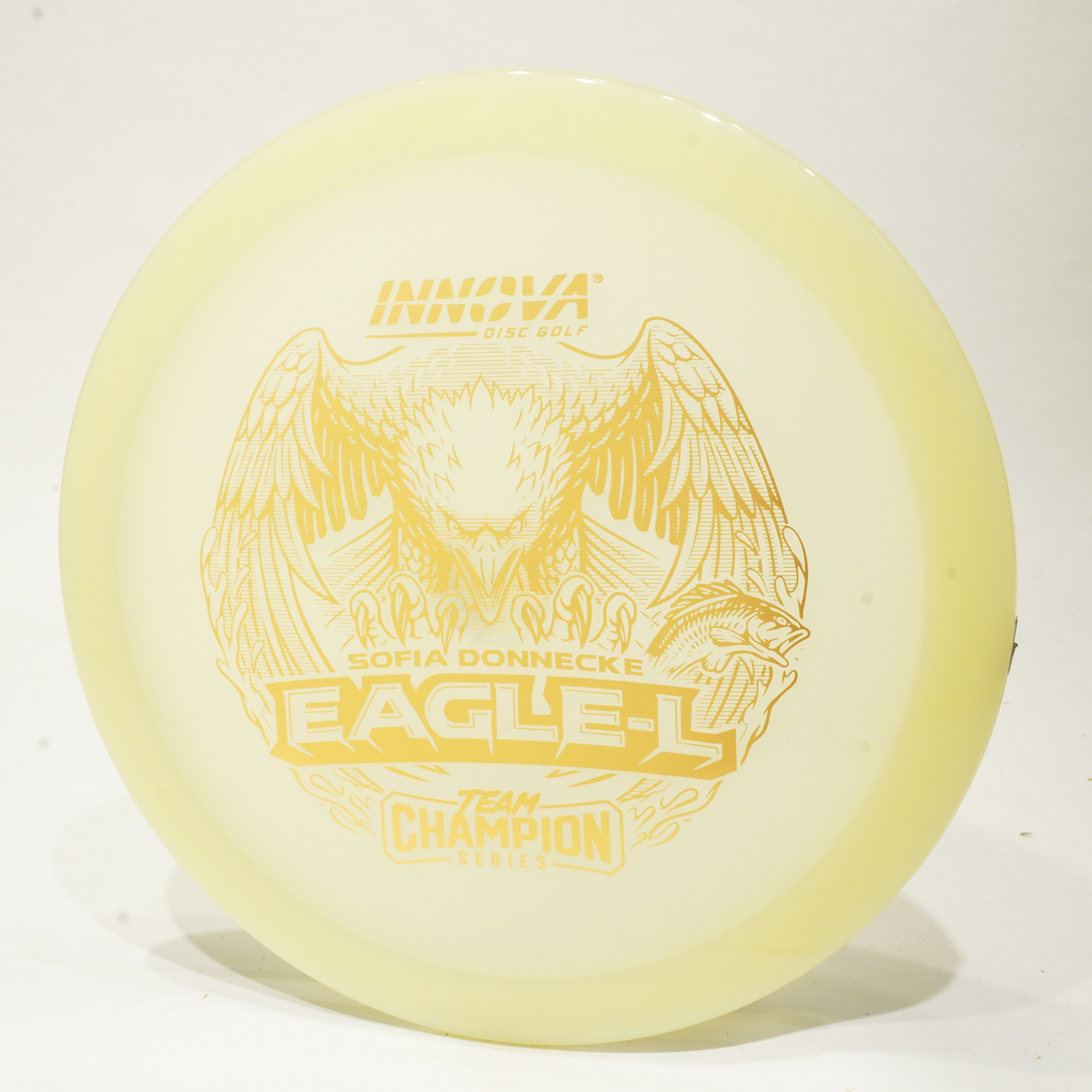 Sofia Donnecke burst onto the scene, taking 3rd at last year’s Portland Open. She is bringing back an old favorite Innova mold, the Eagle-L, in new Proto Glow Champion material. The stamp suggests she’s swooping in for the kill in 2025.